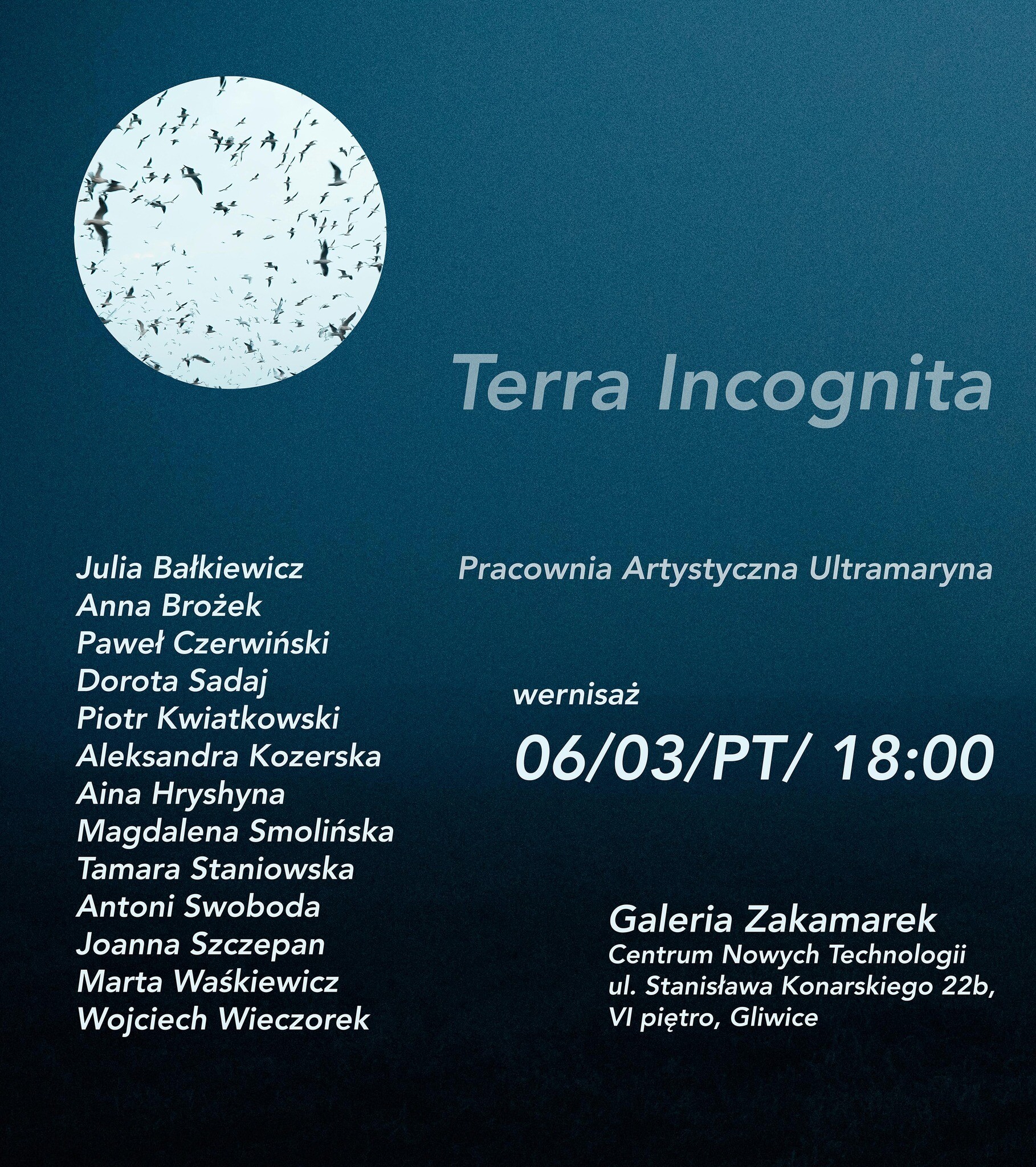 Wernisaż wystawy pod hasłem "Terra Incognita" odbył się 06.03.2026 o godzinie 18:00 w Galerii Zakamarek, mieszczącej się w Centrum Nowych Technologii Politechniki Śląskiej, w Gliwicach przy ul. Konarskiego 22b, na 6 piętrze. W wystawie prace pokazali Twórcy związani z pracownią.